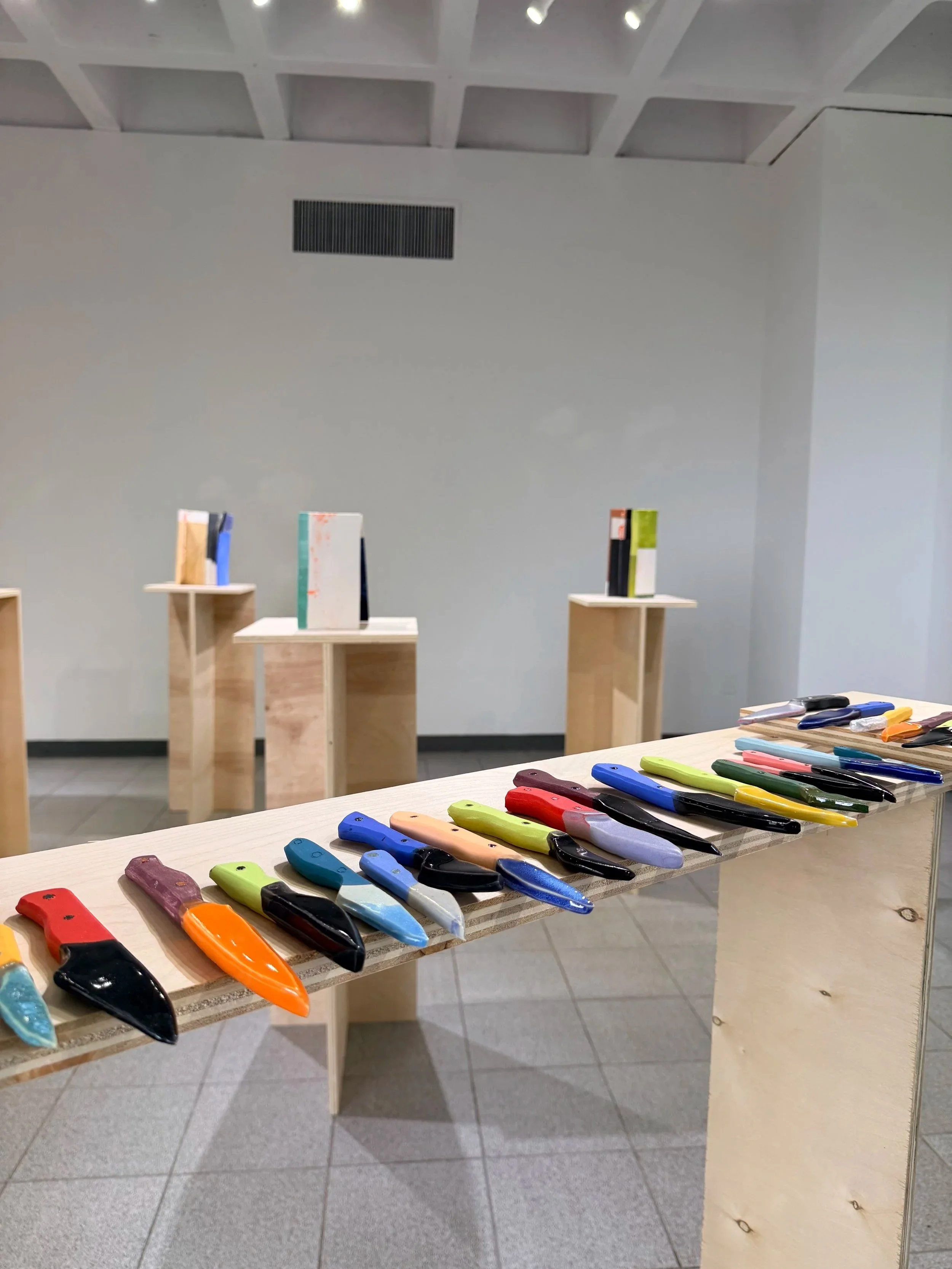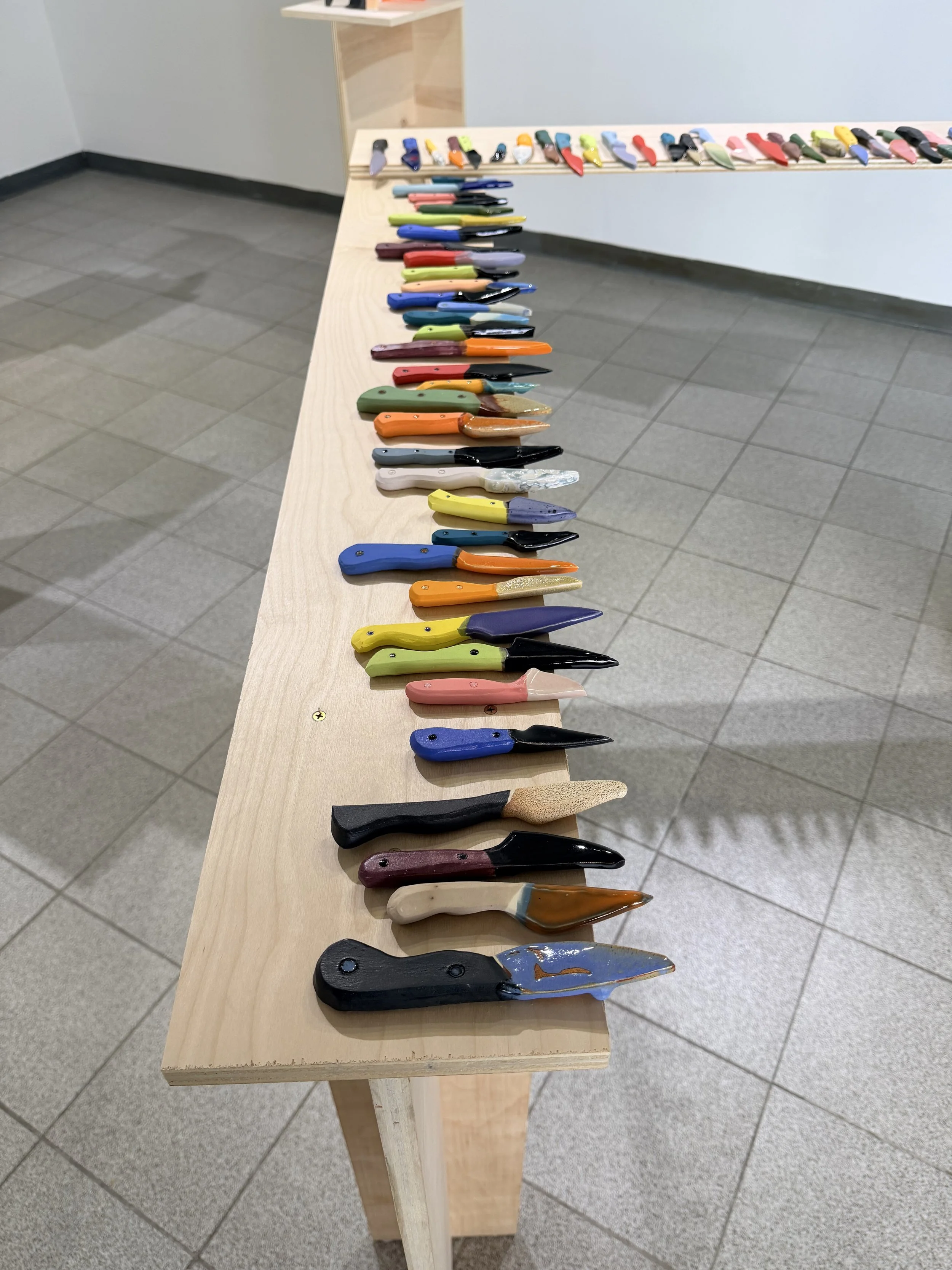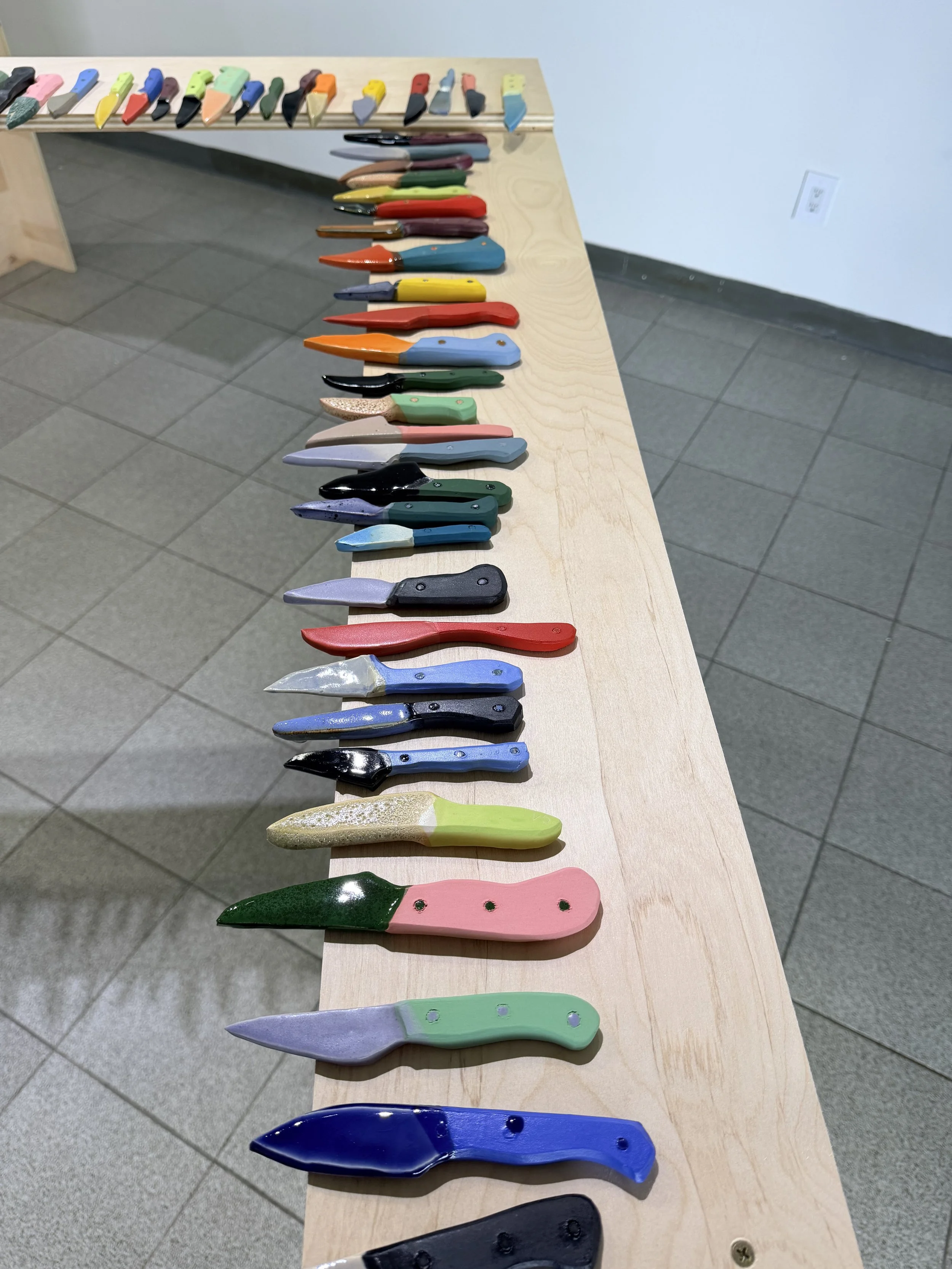 At the center of the show are two deceptively familiar forms: the I-beam and the knife, painterly glazed in rich color blocks that transform the industrial and utilitarian silhouettes. Color here is not decoration but argument, stripped of their identity and rebuilt in a medium that seems to contradict them entirely. It interrupts the reading of these forms, forcing question of their weight, threat, and authority. The result are objects that hold their shapes but question their certainties.