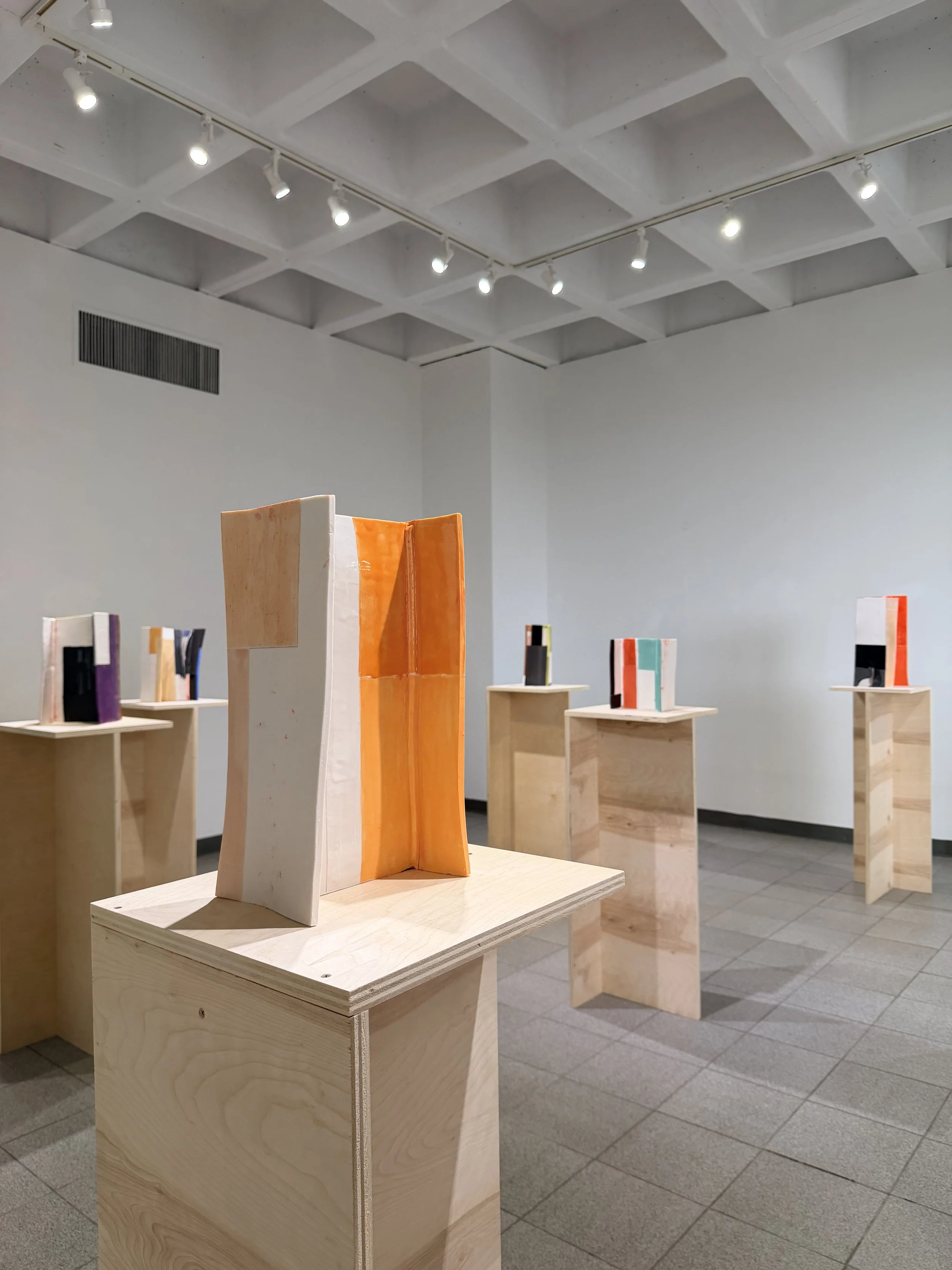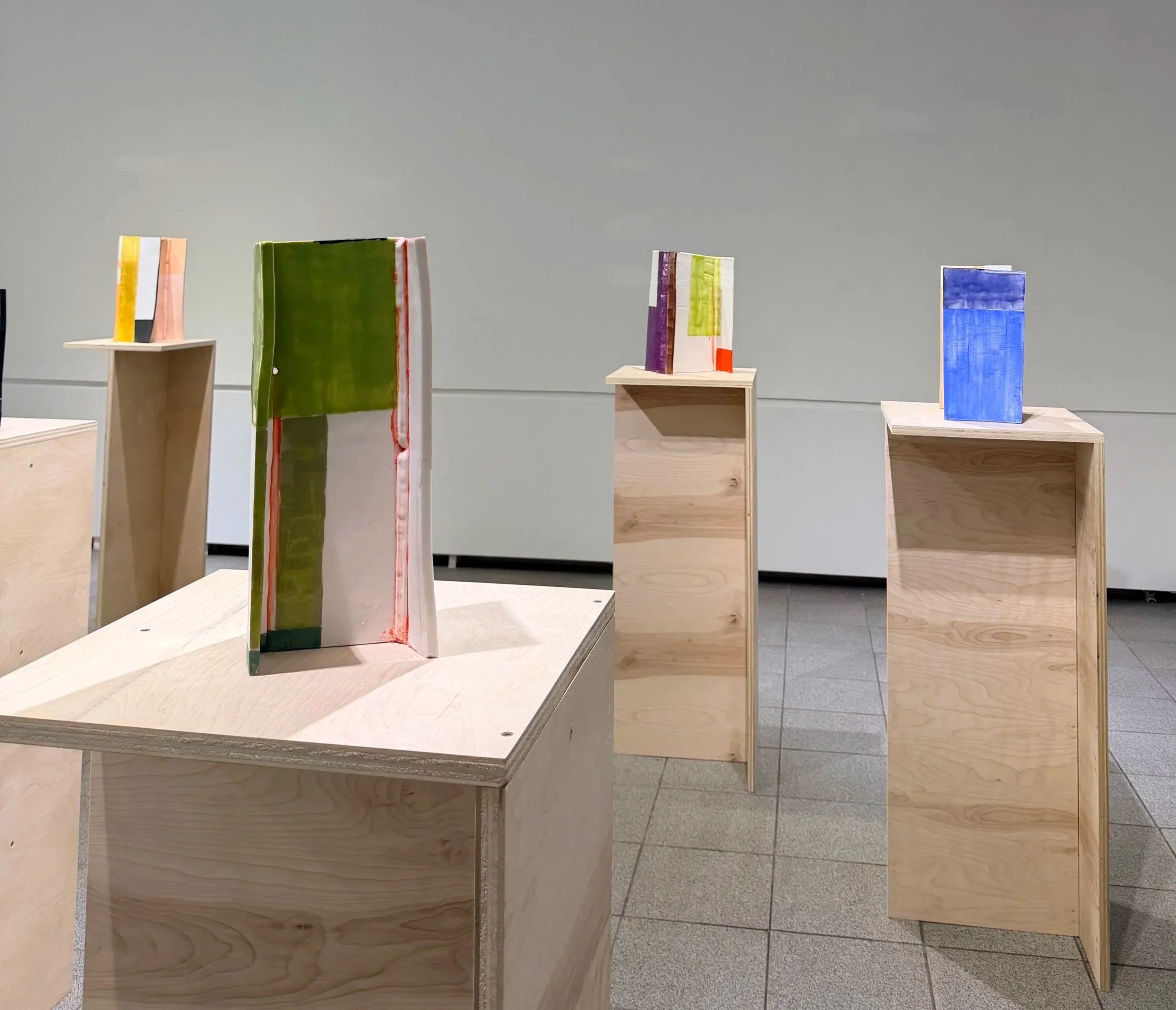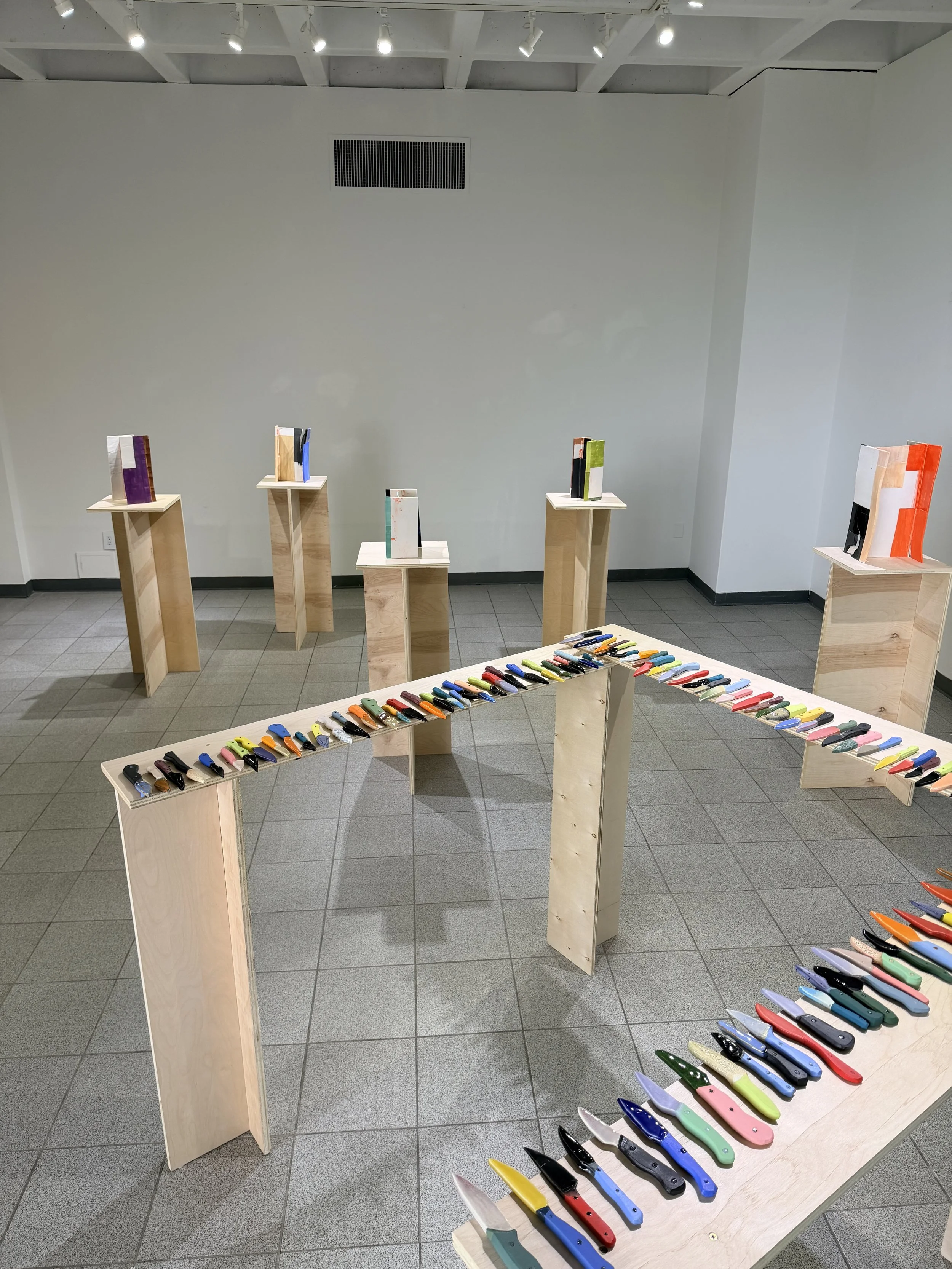 At the center of the show are two deceptively familiar forms: the I-beam and the knife, painterly glazed in rich color blocks that transform the industrial and utilitarian silhouettes. Color here is not decoration but argument, stripped of their identity and rebuilt in a medium that seems to contradict them entirely. It interrupts the reading of these forms, forcing question of their weight, threat, and authority. The result are objects that hold their shapes but question their certainties.